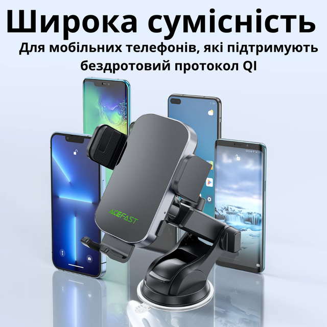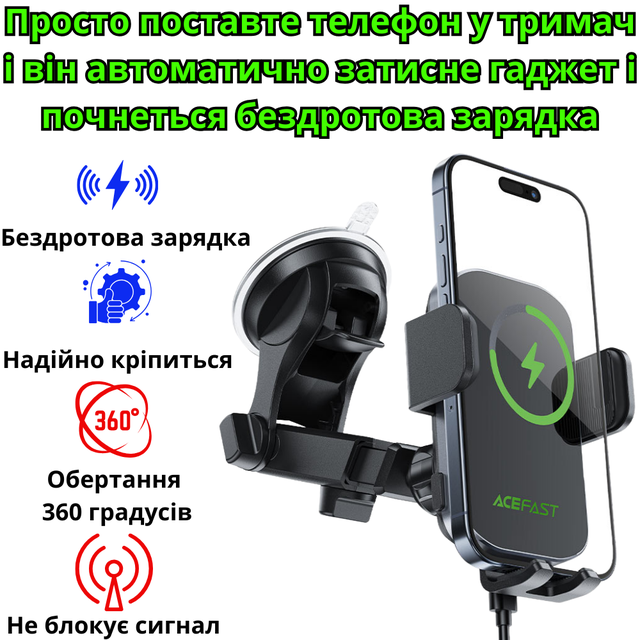 Оригінальний автотримач для телефона зі швидкою бездротовою зарядкою 15W на лобове скло на панель автомобіля або в решітку швидка зарядка 15W ACEFAST