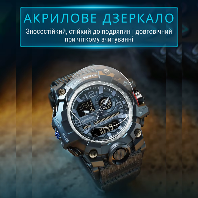 Sanda Army - це спортивно-тактичний протиударний водонепроникний годинник ⌚, що пропонує надійну функціональність і високий ступінь захисту в екстремальних умовах 🌊🔥. Він має низку особливостей:
