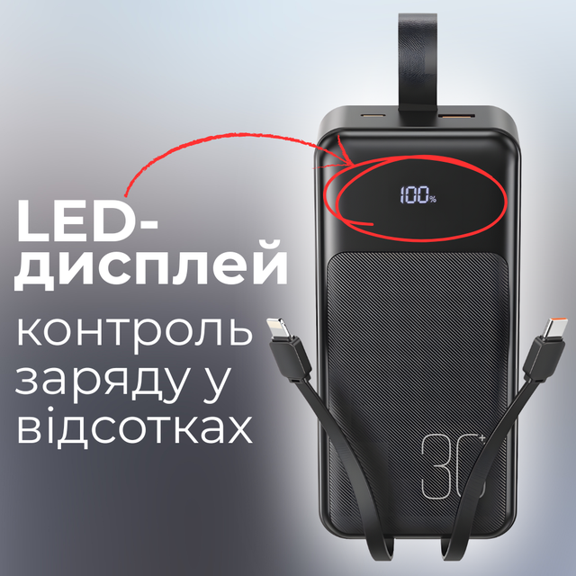 Зручний і місткий повербанк із підтримкою Power Delivery і Quick Charge 3.0, вбудованими кабелями Type-C і Lightning і LED-дисплеєм.
