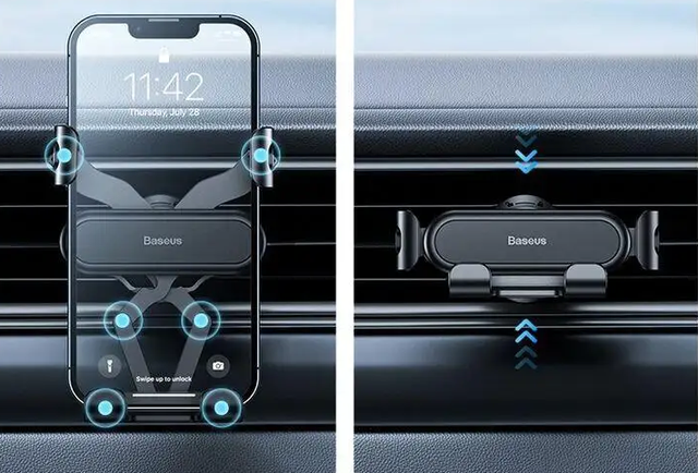 Надійно кріпиться. Baseus встановлюється в дефлектор за допомогою розсувного пружинного механізму з гаком. Такий замок підходить до повітропроводів і не дасть змоги тримачу зміститися зі свого місця під час їзди по нерівностями.