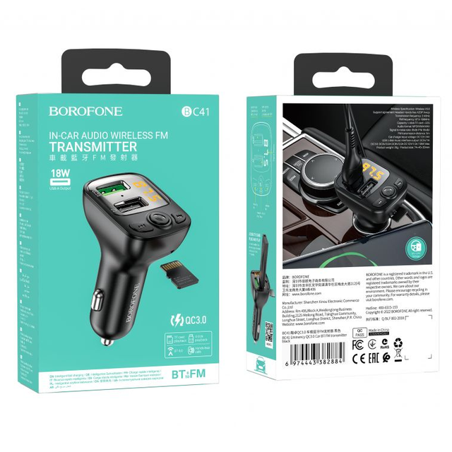 Автомобільний BOROFONE BC41 2-USB 3.1A Quick Charge 3.0 має функцію бездротового з'єднання Bluetooth до телефону. Вбудований мікрофон дає змогу використовувати цей FM-модулятор як гарнітуру гучномовця.
