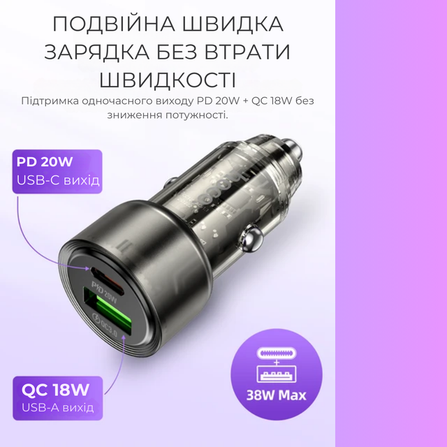 Автозарядний пристрій із подвійною швидкою зарядкою та стильним напівпрозорим дизайном HOCO Z52 PD38W