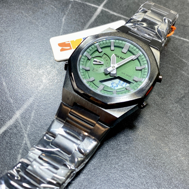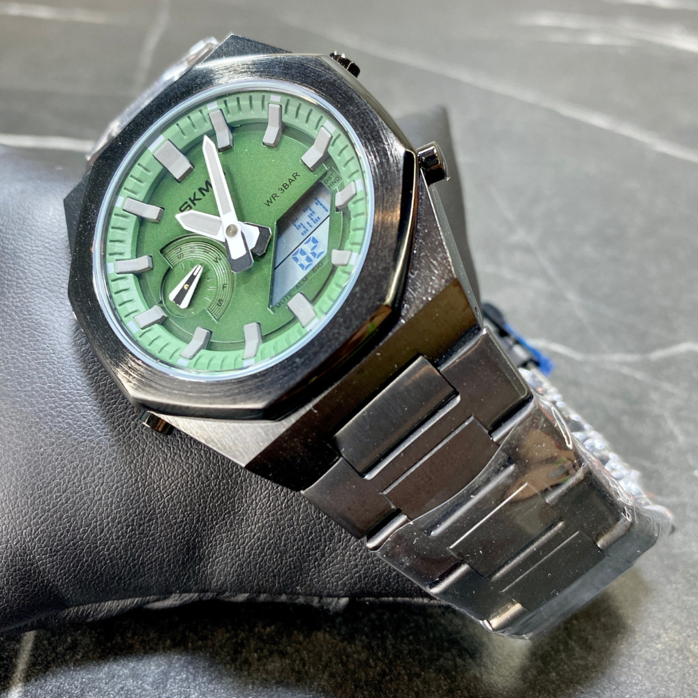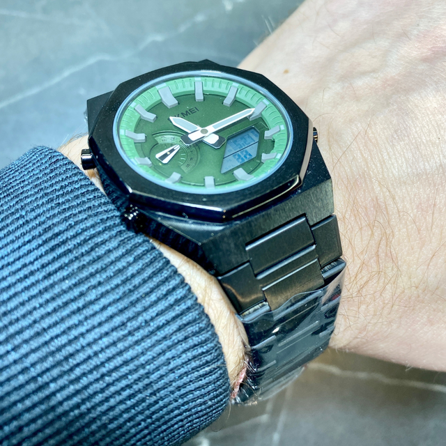 Зелений циферблат з великими сріблястими стрілками і мітками, а також додатковими багатофункціональними цифровими дисплеями додають технологічний акцент, підкреслюючи стиль і статус власника 🕶️✨.