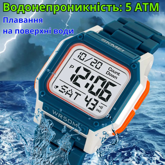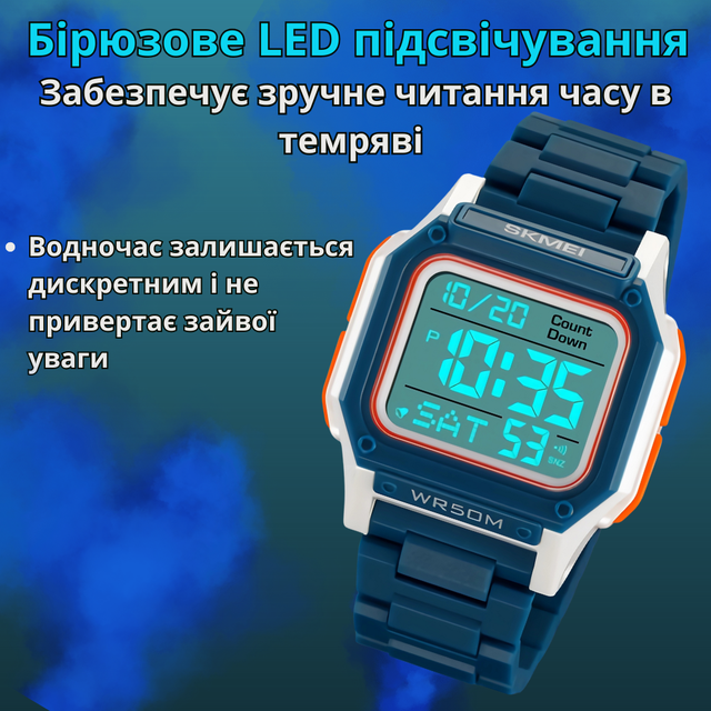 | Тип призначення | Синій спортивний годинник чоловічий наручний водонепроникний з підсвічуванням будильником секундоміром цифровий Skmei |