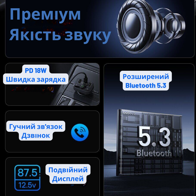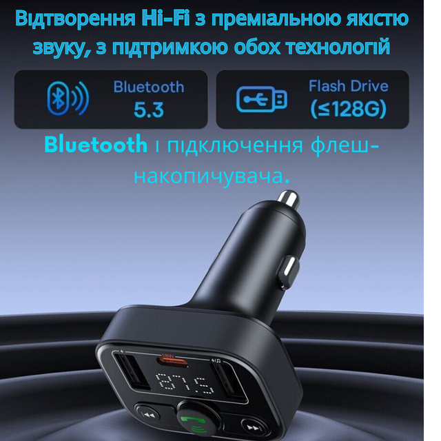 | Тип призначення | Фм модулятор із функцією гучного зв'язку Fm трансмітер у машину с хорошим звуком з зарядкой Usb и PD Baseus |