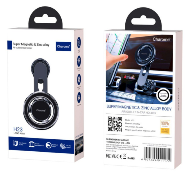 CHAROME H23 – це компактний магнітний тримач, який забезпечує надійну фіксацію смартфона під час водіння. Завдяки міцному кріпленню до дефлектора вентиляції він не займає зайвого місця, але при цьому завжди тримає телефон у полі зору водія.