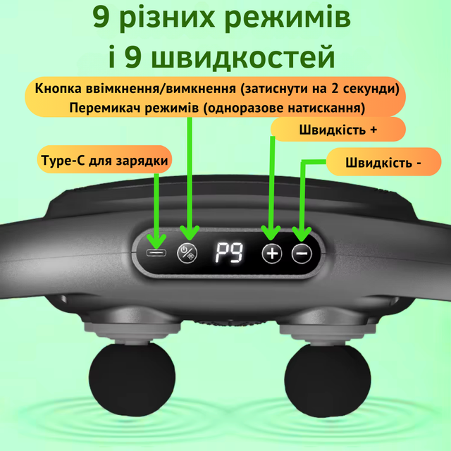 | Область застосування масажера | Передпліччя, Плечі, Черевний прес, Стегна, Ікри, Ступні, Шия, Спина, Сідниці, Руки, Ноги, Груди, Коліна, Все тіло, Щиколотки |