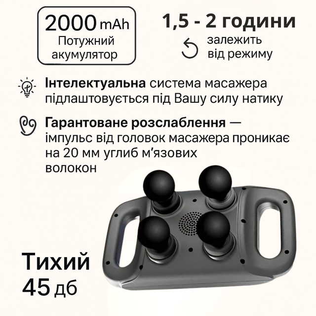 | Тип призначення | Ручний масажер із 4 масажними головками для тіла спини ніг шиї Акумуляторний ударний Перкусійний Fascial4D |