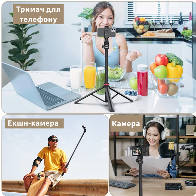 - Функціональність 3-в-1: Використовуйте як штатив, монопод або селфі-палицю залежно від ваших завдань.