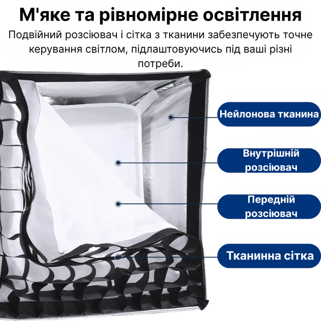✅ Знімна тканинна сітка для точного керування світлом