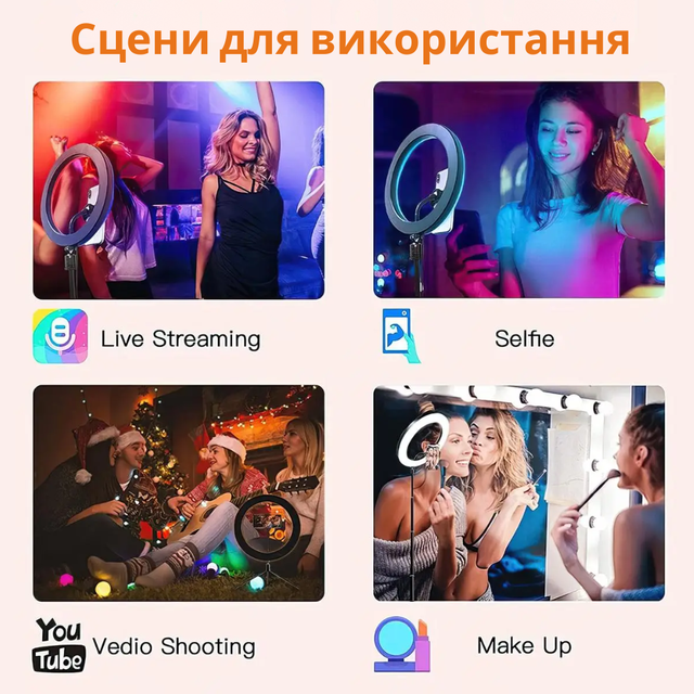 | Тип призначення | Кільцева лампа кольорова RGB LED зі штативом і тримачем для телефона від USB 26 см для тик струму селфі |